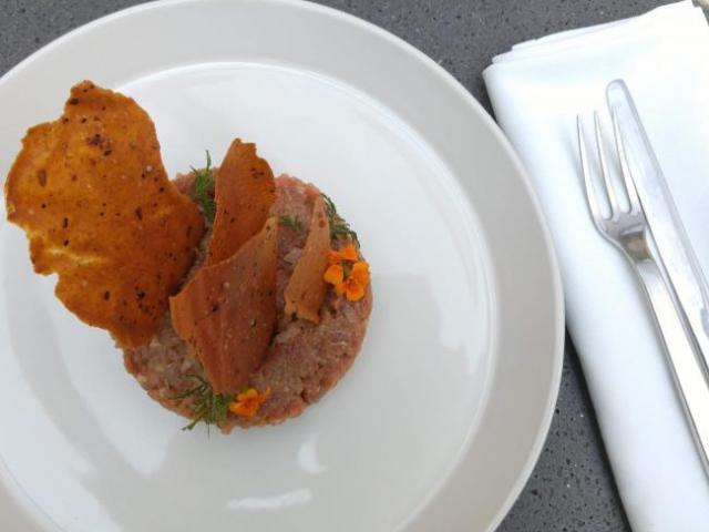 Salade de crabe – Crédit photo : Tommy DionL'heure aux décisions, nous nous entendons pour la tomate (6$), le tartare de bœuf wagyu (16$), la salade de crabe (14$) et le croque-monsieur aux champignons sauvages (9$).