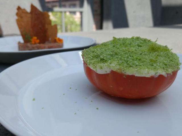 Le premier, tout en fraîcheur, met en vedette une demie tomate cœur de bœuf, sur laquelle s'étage une fine couche d'aïoli, puis du panko au zeste de citron et coriandre. Dommage que la tomate n'était pas à son apogée ! Avec un aïoli n'attendant que les jus de la tomate pour dupliquer sa saveur et le panko pour ajouter la texture, ça aurait été une note parfaite. Malheureusement, le panko asséchait trop rapidement la tomate, rendant le tout moins plaisant à déguster. Néanmoins, l'idée et les combinaisons de saveurs y étaient.