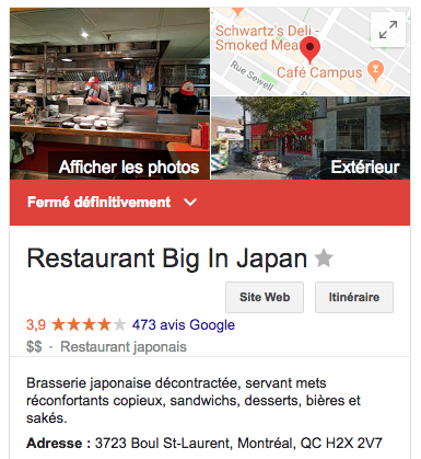 Après le Bighi Curry et le Lili.Co, c'est au tour du resto-bar Big in Japan de mettre la clé dans la porte. Eh oui, le resto préféré de bien des Montréalais a mystérieusement fermé ses portes il y a quelques jours, sans prévenir qui que ce soit.
