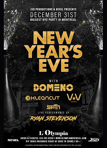 Pour le Nouvel An, l'Olympia de Montréal te réserve toute une soirée! Voici ce qui t'attend: une performance live de Ryan Stevenson ainsi que des sets enflammés de la part des DJs Domeno, Kleancut, Vito V et Spin, le tout dans une ambiance des plus festives!