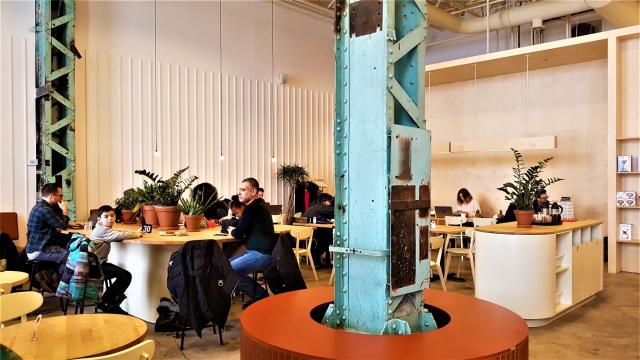 Crédit photo Sophie GinouxSituée dans un ancien entrepôt de pièces d'ordinateurs, la Station W Angus est vaste (une soixantaine de places intérieures sans compter la terrasse estivale), lumineuse avec ses plafonds immenses et assez jolie à voir grâce à son comptoir de service en carrelage rouille, ses grandes colonnes en fer industrielles, ses éléments de mobilier clairs et sa blancheur aux murs comme au plafond. La décoration est discrète pour laisser s'exprimer l'architecture du local.