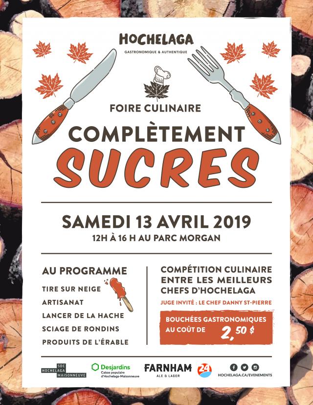 Le 13 avril prochain se tiendra au Parc Morgan une compétition entre les meilleurs chefs d'Hochelaga, dans le cadre de Complètement Sucres 2019! Au menu: tire sur neige, bouchées gastronomiques à petits prix, produits d'artisanat locaux, musique et activités traditionnelles telles que le lancer de la hache! Ne manquez pas ça!