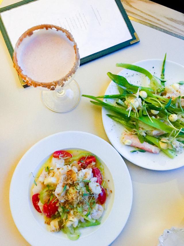 Nous nous sommes installé.es près de l'immense baie vitrée (grande ouverte) avant de commander deux cocktails, un gin fizz au pamplemousse et un charlananas, afin de faire semblant que l'été était déjà arrivé.