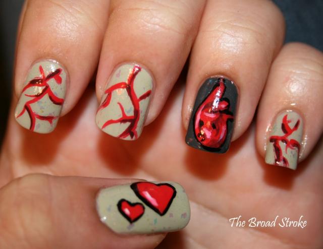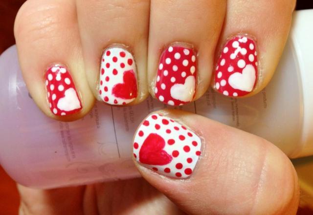 1-Le match parfait avec ta petite robe noire? Une mani à pois rouges et blancs, c'est ce qu'il te faut! Ajoutes-y un petit cœur pour rendre le tout un peu plus festif. (via)