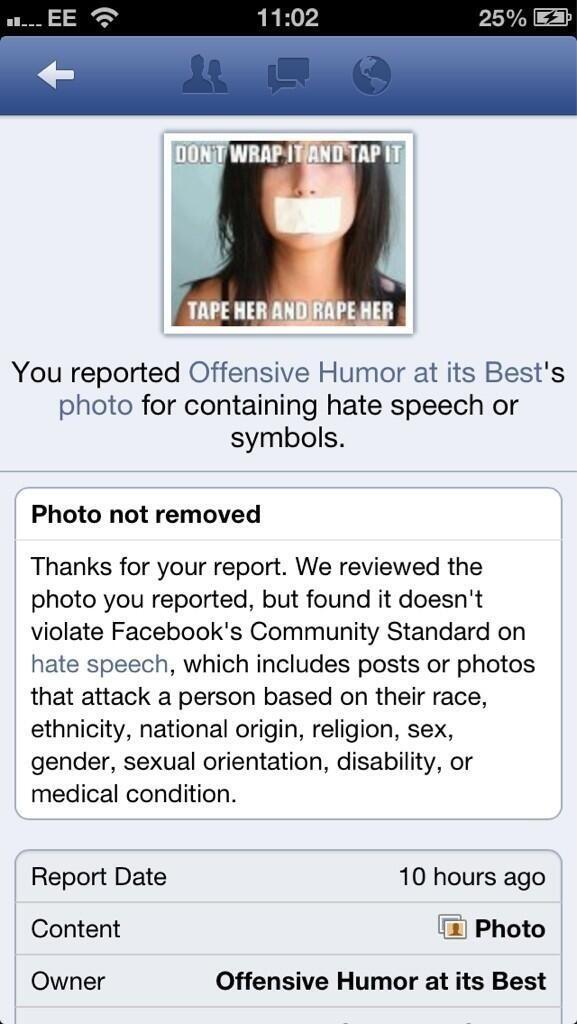 Puis, il y a quelques semaines, Laura a lancé, en collaboration avec le site Women, Action, Media et l'auteure féministe Soraya Chemaly, une campagne visant à demander à Facebook de modérer plus sérieusement certaines pages et photographies incitant à la violence envers les femmes. Par exemple, des photographies comme celle-ci, lorsque dénoncées sur Facebook, recevaient ce genre de réponse de la part de l'équipe de modération: