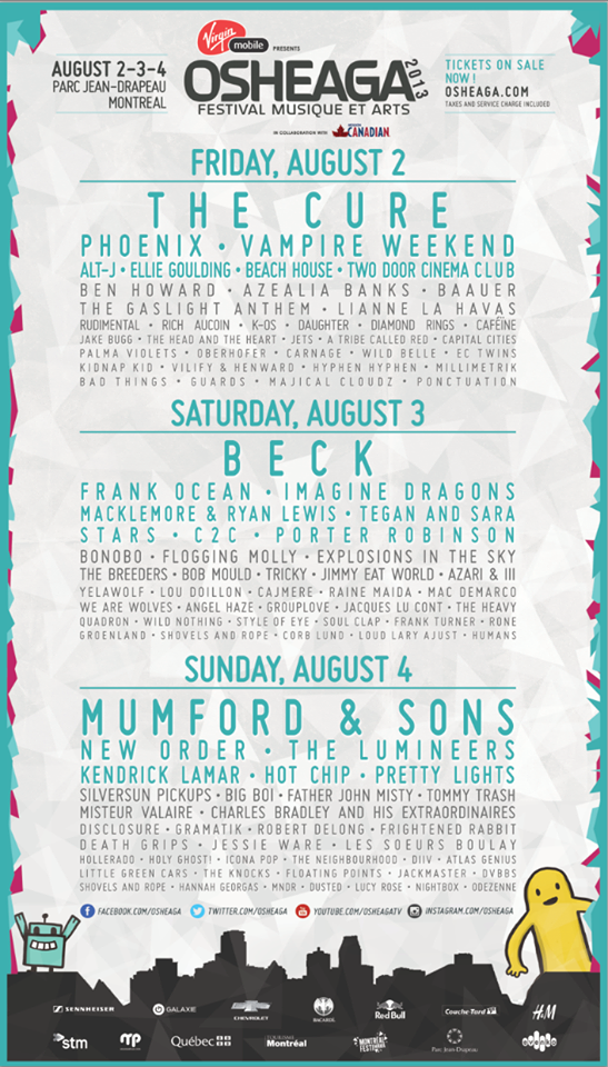 En tête d'affiche, The Cure, Phoenix et Vampire Weekend ouvrent les festivités du vendredi et le samedi accueillera Beck ainsi que Frank Ocean et Imagine Dragons. Finalement, les populaires Mumford & Sons, New Order et l'omniprésent The Lumineers concluront les festivités. Vous trouverez tous les détails de la programmation ci-bas!