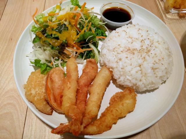 L'accent est sur les plats rapides pour le lunch. Il y a une section prêt à apporter qui contient des sushis et des salades. La section chaude se concentre présentement sur les donburis et une version plat des donburis. Un donburi consiste en une bonne portion de riz sur laquelle on dépose un ingrédient de notre choix. Au moment de notre passage, il y avait quatre choix : poulet teriyaki, poulet frit, crevette tempura et légumes tempura. La version plat ajoute une salade au tout.