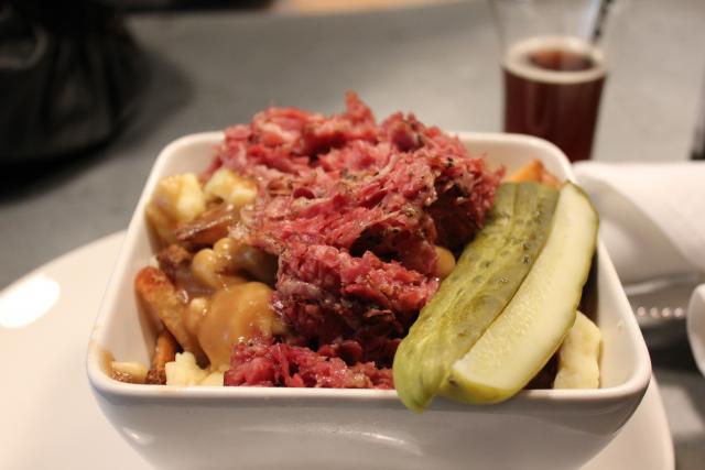 Afin d'avoir une meilleure idée des plats servis habituellement, j'ai donc décidé de commander la poutine à la viande fumée et le hamburger du marchand. Celui-ci, concocté avec du bœuf kobe, était vraiment excellent; tout de ce qu'on s'attend d'un bon hamburger. La poutine était pour sa part assez bonne, mais j'ai trouvé la sauce farineuse. Faudra peut-être montrer aux Torontois comment faire une bonne sauce à poutine!