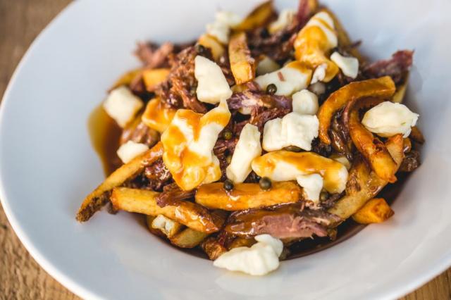 Suit une poutine au canard très réussie. Les frites, bien croustillantes et fondantes, sont accompagnées de fromage en grain de la Fromagerie Saint-Guillaume, d'une sauce au poivre beaucoup moins robuste que celle à laquelle on nous a habitués ailleurs, et de morceaux de canard « à la montréalaise » qui ont été saumurés, puis fumés avec des épices à smoked meat, avant d'être confits dans du gras de canard. Le résultat en bouche est délicieux.