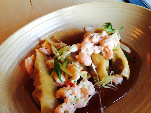 Dumplings fourrés au porc et surmontés de crevettes nordiques servis dans une sauce acidulée collante, enveloppante. On est à des lieues des versions traditionnelles proposées au quartier chinois, pourtant si proche.