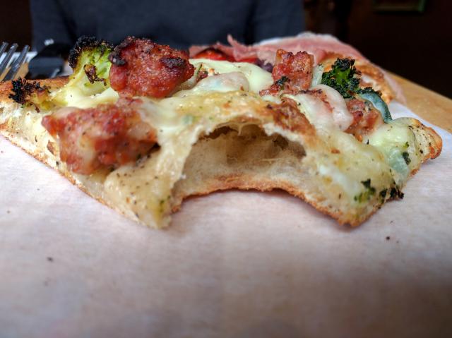 La sauce tomate n'est ni trop salée, ni trop acide. Au goût, nous pouvons clairement détecter la fraicheur des ingrédients. Celle au jalapeno, oignon et saucisse est épicée à souhait. Juste assez pour piquer légèrement la langue. Le brocoli bien rôti ainsi que le fromage provolone accompagnent parfaitement le côté plus gras de la saucisse. La pizza peut aussi être pimpée avec de la charcuterie pour un léger supplément. Le prosciutto venait compléter parfaitement le trio focaccia, tomate et olive. Le guanciale sur les champignons chiodini et tomate. Celui-ci apportait le sel requis et s'agençait très bien avec le champignon.