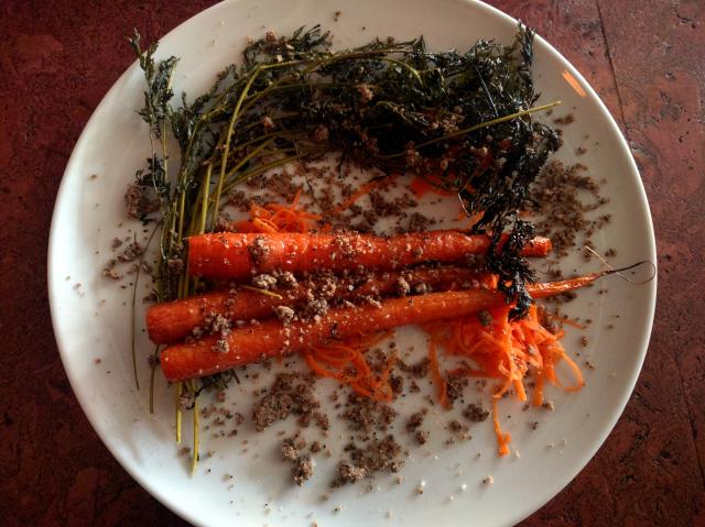 Le premier plat : carottes fanes rôties. La présentation est très soignée, c'est un point que j'ai remarqué toute la soirée. Le goût est légèrement fermenté et me rappelle un peu le maïs ou le blé. Les feuilles de carotte sont rôties quoiqu'un peu fibreuses. La laque au miel ajoute une touche de sucré et le crumble au café ajoute de la texture au plat. Très bon! Et le vin tchèque (Nestarec) avec un léger goût d'allumette, un côté floral et une petite pointe de miel est parfait avec ce plat.
