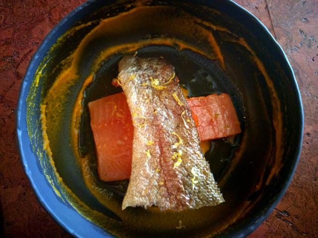 La truite les bobines presque crue est d'abord dégorgée au sel avant d'être à peine cuite. Accompagnée d'une purée d'argousier et carotte ainsi que de la courge fermentée. Petit goût fermenté, salé, un peu poissonneux, la texture du poisson est ferme. L'argousier ajoute une belle acidité qui est intéressante et qui remplace agréablement le traditionnel citron. La peau croustillante ajoute une texture complémentaire au plat.