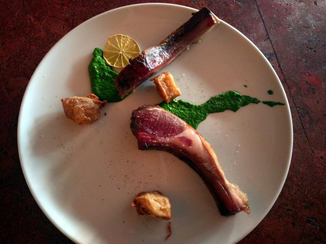 Le plat d'agneau de Kamouraska accompagné de pomme tempura et d'une purée de coriandre. L'agneau est vieilli pendant 15 jours. L'agneau est un tantinet ferme. Le gras en contrepartie fond dans la bouche! La purée de coriandre se marie bien avec l'agneau. Assiette légèrement trop dénudée pour son prix toutefois.