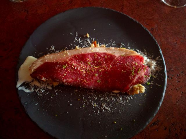 Le carpaccio de bœuf consiste d'une belle tranche épaisse et bien grasse. Un peu de sel, une mayonnaise de cèdre, des chips de champignon eryngii et un peu de parmesan. Le cèdre surprend un peu, mais va bien avec la viande. J'avais peur que la combinaison de la mayonnaise et du gras soit trop riche, mais l'ajout du cèdre aide à balancer le tout.