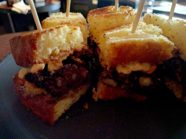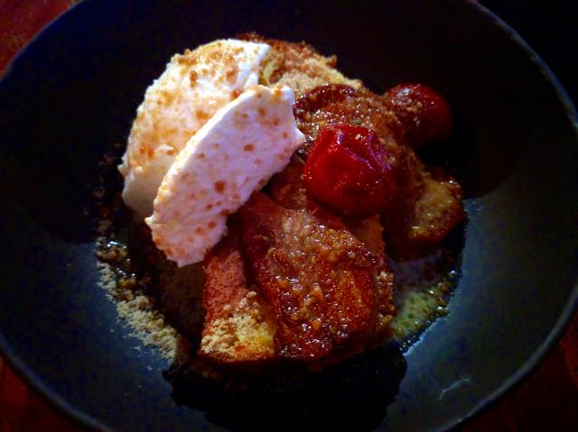 Le 4/4 à l'érable bio, foie gras, yogourt de buffalone. Gâteau dense, mais somme tout moelleux. Le yogourt casse le sucre et aide à apporter un équilibre au plat en y ajoutant de l'acidité. Le foie gras rend le tout très riche. Le sirop d'érable est bien dosé et la cerise apporte le côté fruité. Le jumelage avec un cava du penedès est audacieux et bien réussi.