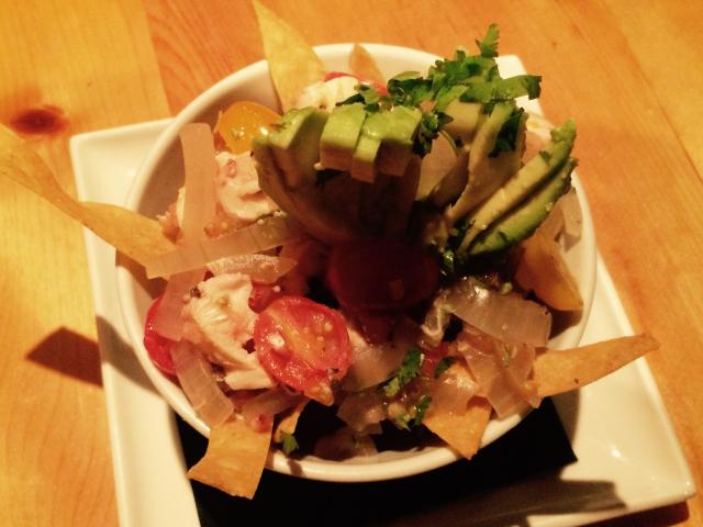 Le guacamole au crabe « épicé » n'était pas vraiment piquant, du moins pas assez pour réveiller mes papilles (Vive notre équipe diversifiée! Marie-Claude avait bien aimé!), servi avec des chips tortillas sans recherche de présentation visuelle élaborée – ce qui caractérise souvent les réinterprétations « fine cuisine » des classiques d'une cuisine humble. Je vous laisse en juger: