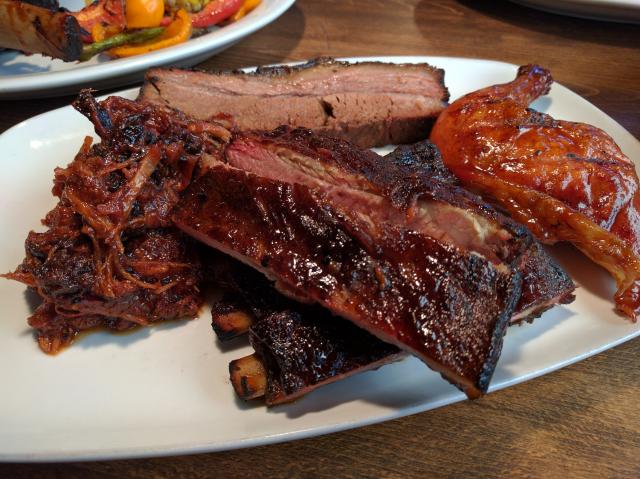 Le menu a beaucoup de choix pour une place à BBQ. Je suis toujours un peu inquiet de voir un menu aussi volumineux lorsqu'il s'agit de ce genre d'établissement. La vaste majorité des très bons BBQ font très peu de choses, mais les font TRÈS bien. Après avoir scruté à la loupe le menu, mon partenaire de repas et moi avons opté pour l'assiette texane à partager ainsi qu'une demi-portion de côtes levées de bœuf.