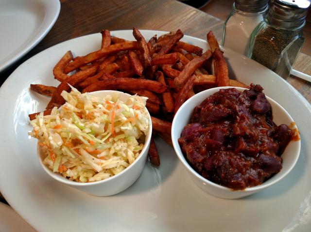 Les frites sont bonnes et sans surprise. Les fèves ont un bon goût fumé, mais un peu trop sucré encore une fois.