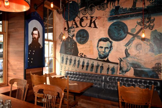 Ce qui nous saute tout d'abord aux yeux au Jack Saloon, c'est son décorum incroyable réalisé par la firme de design Surface Jalouse. Au resto, on nous invite à nous immerger dans la Guerre de Sécession américaine, avec des atmosphères distinctives du Nord et du Sud. Une volée de marches plus bas, c'est un hybride entre une ancienne maison close et un lieu de culte un brin satanique qui nous accueille. C'est simple, on passerait des heures à admirer tous les détails de ce magnifique décor, y compris aux toilettes!