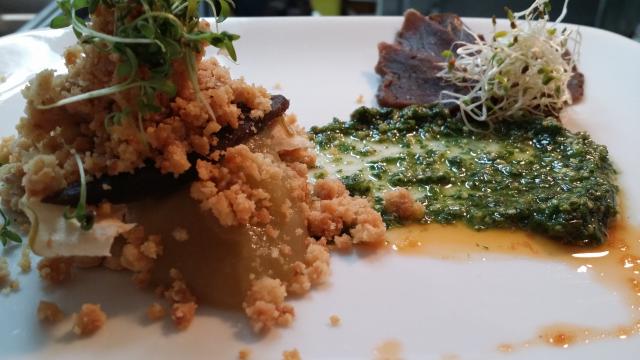 L'ingéniosité est aussi là à tous les services. Elle peut s'exprimer en entrée avec un crumble salé constitué de sablé, de cerf mariné, de pesto de roquette et de déclinaisons de pomme (chips, compote). Un vrai délice.
