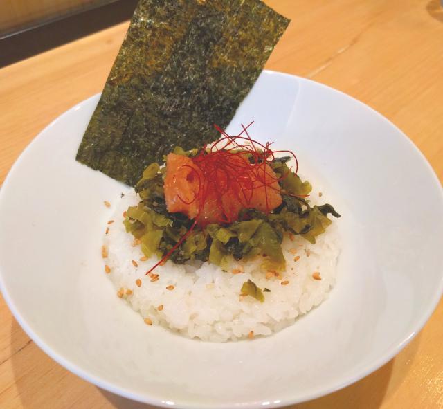 Le menu est court : 4 plats d'accompagnement, 3 ramens et un dessert. Le premier plat, un donburi de mentaiko et takana.