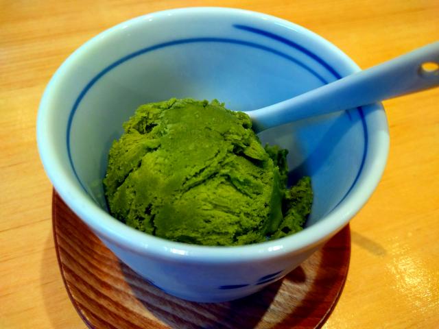 Pour le dessert, il s'agit d'une crème glacée au thé matcha fait maison. Elle est friable et légèrement sucrée. Bon, mais pas renversant.