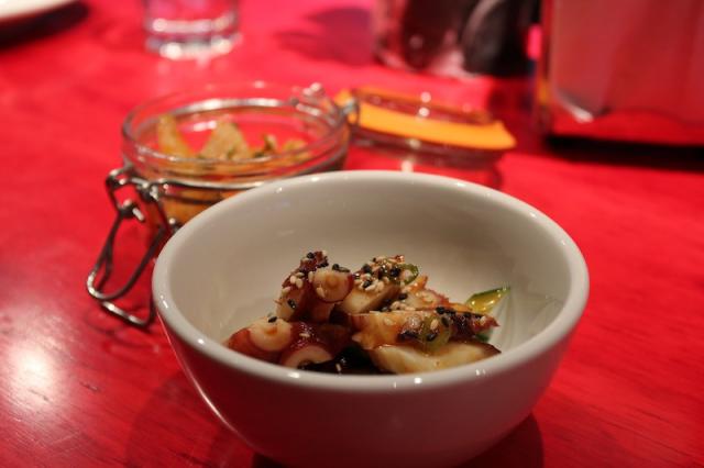 Nos papilles en ont cependant eu pour leur argent avec les petits plats à partager. On a adoré le kimchi daikon, du daikon fermenté aux épices Saka-Ba!, le poulet bio frit et les beignets fourrées au porc et cari. La salade de pieuvre et sauce épicée nous a par contre laissé un peu indifférents…