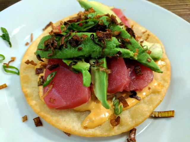 Dans la section entrée, la tostada au thon était excellente. Le poisson était extrêmement frais et fondait dans la bouche. La tostada était bien faite et craquante comme elle se devait. Les poireaux frits, quoique non standard comme ingrédient dans ce genre de cuisine, apportaient un goût très intéressant. Une très belle entrée.