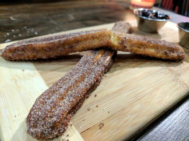Dans la section choses à améliorer : la friture. Le taco au poisson baja a déçu. L'huile n'étant pas à la bonne température, la pâte était imbibée d'huile et le tout était légèrement sous cuit. Le plat de churros soufrait aussi du même problème de technique de friture. Il est arrivé sous cuit, au point ou le churro a plié et s'est ouvert. Dommage, car je m'attendais tellement à recevoir un churro léger et craquant. Et doublement dommage, car les sauces de chocolat épicé et caramel au sel étaient excellentes au goût. Celle au chocolat avait saisi par contre, autre petit élément technique à peaufiner.