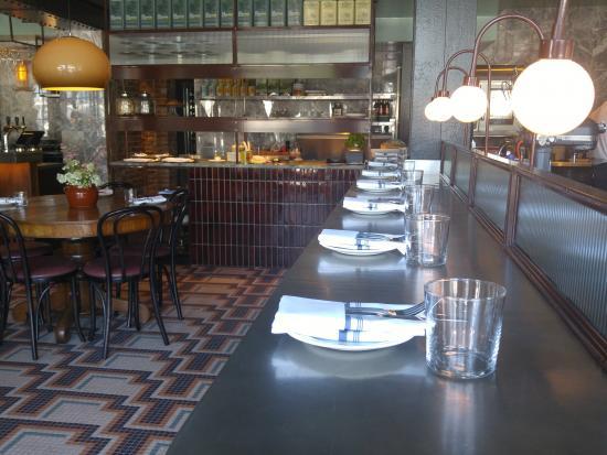 Le plancher en mosaïque, additionné au jeu de différents matériaux et de couleurs — par exemple les magnifiques banquettes mauves et vertes —, rendent l'endroit à la fois unique et intemporel. Le long bar, situé au fond et faisant presque la longueur du restaurant, donne bien envie de s'y installer le temps d'engloutir un café et biscotti, ou de siroter un Spritz en bonne compagnie !