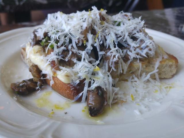 Nous avons droit à une tranche de miche bien grillée, coupée en deux et sur laquelle s'empile en ordre crème de ricotta, pois verts, mélanges de champignons – shiitake, pleurote, de Paris —, ricotta salata râpée et zeste de citron. C'est crémeux, craquant, fondant… À cela s'ajoute la sapidité complexe des champignons, le salin de la ricotta et l'acidité du zeste qui rend cette petite (peut-être trop petite ?) bruschetta un vrai plaisir à savourer.