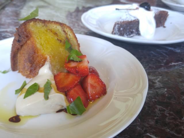 En guise de desserts, nous avons opté pour la torta all'olio verolio, à savoir un gâteau à l'huile d'olive (encore !), mascarpone et fraises, ainsi que la torta caprese – gâteau au chocolat noir et crème sûre fouettée. Double réussite ! À simple vue d'œil, on peut remarquer le premier gâteau bien imbibé d'huile d'olive qui, cette fois-ci, ne m'a pas déplu du tout. Ce côté huileux ne se retrouve pas en bouche, laissant davantage place à un cake moelleux, au goût légèrement citronné. Avec le crémeux du mascarpone, la fraîcheur des fraises et des brindilles de basilic, difficile de ne pas laisser aucune miette.
