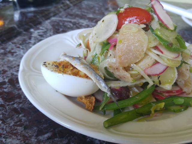 Insalada Di Tonno. Thon confit maison, fenouil, œuf mollet, haricots verts, olive, anchois. En d'autres mots une salade niçoise, avec fenouil. Bien que les grelots inscrits dans la description manquaient à l'appel, les saveurs franches et l'huile d'olive elles, étaient bien présentes. Oubliez le thon en conserve commercial… Celui-ci est délicat et fond littéralement en bouche. Le mélange croquant de légumes baignait un peu trop dans l'huile d'olive à mon goût, mais ça ne nous a pas empêché, mon collègue et moi, de ne rien laisser dans l'assiette.