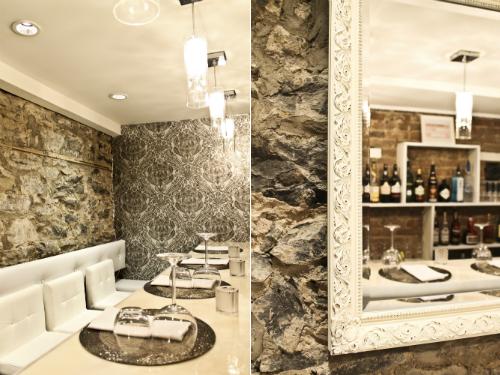 Côté ambiance, le petit resto situé à quelques pas de l'avenue Mont-Royal est sophistiqué à souhait. Sébastien, le propriétaire, est aussi soucieux de la qualité de ses produits qu'il l'est pour la présentation et le décor (de la serviette de table en tissu aux des bancs chics). L'idée est donc d'offrir de la qualité de A à Z. Dans un esprit lounge, aux accents métalliques et aux couleurs froides, le restaurant est réchauffé par des murs de brique, un petit foyer et un panache.