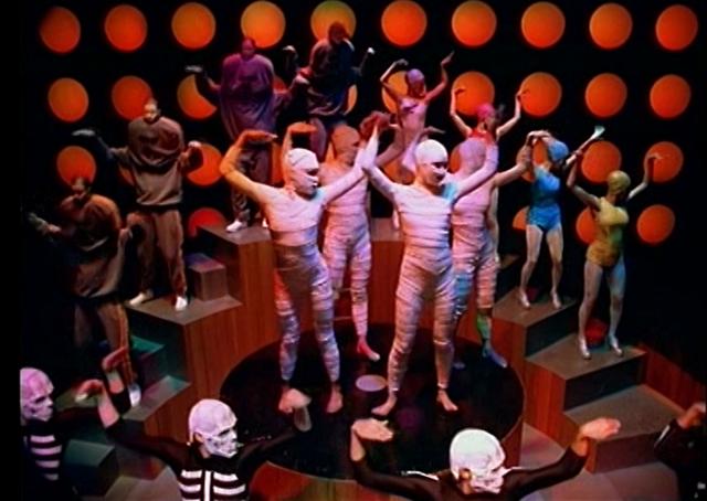 Partition musicale visuelle, les éléments s'animent au rythme de la musique. Au menu: des squelettes dansants, des filles en maillot de bain, des robots qui se rentrent dedans.