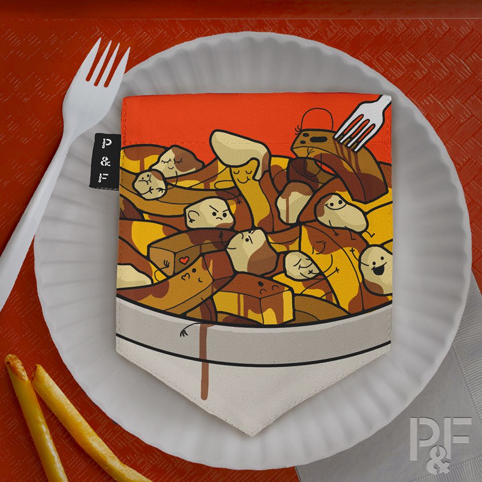 Poches & Fils, on le sait, ils sont reconnus pour leur design de poches funkys et très montréalaises. La poche à l'effigie de la poutine était donc un ajout bien naturel à leur collection. L'affaire, c'est que la poche, elle n'a pas encore de nom. C'est pourquoi la compagnie demande l'aide de leurs fans Facebook pour baptiser la poche. Le grand gagnant se méritera le t-shirt en question. Cool, non?