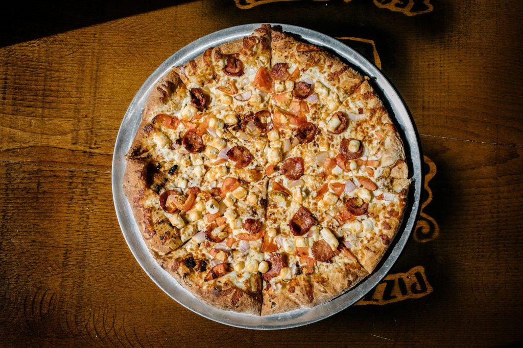 Ingrédients: Sauce tomate, pepperoni, Mozzarella, smoked meat, piments et champignons.