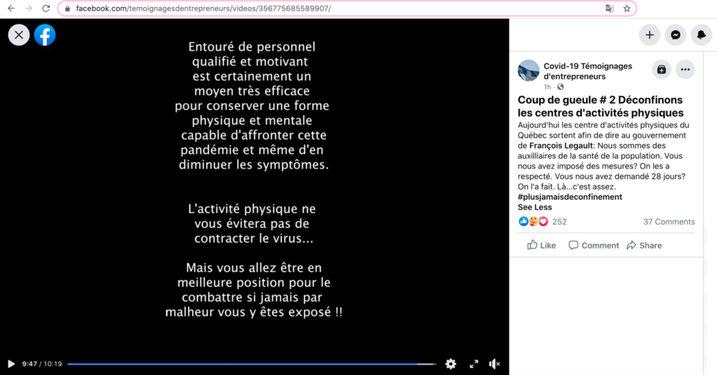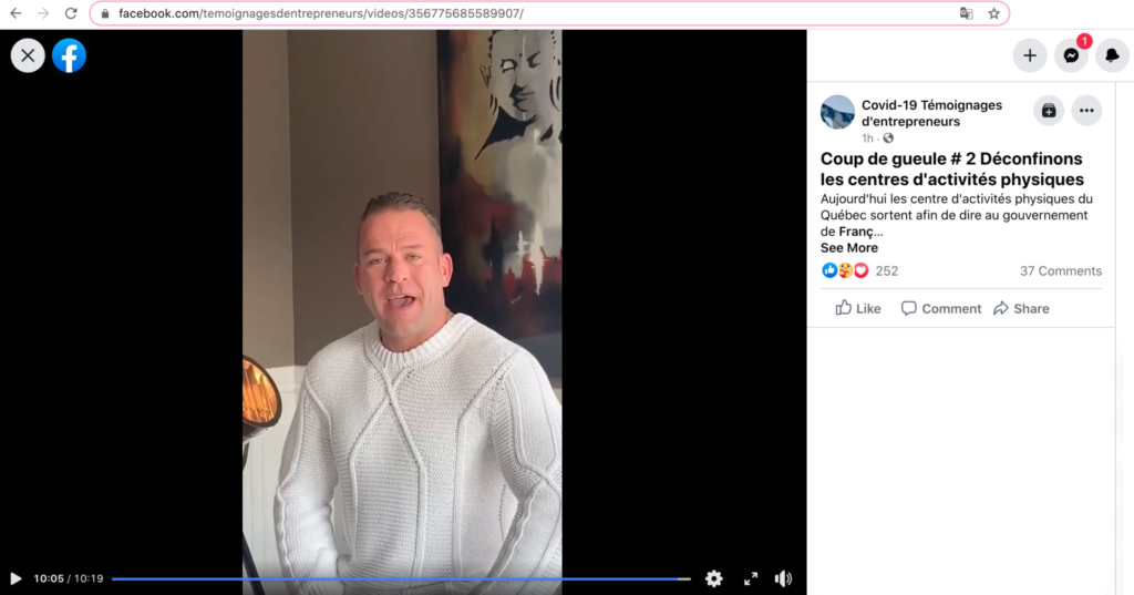 Intitulée « Coup de gueule # 2 Déconfinons les centres d'activités physiques » , la vidéo commence avec un message questionnant la pertinence de la fermeture des centres d'entraînement et salles de sports, alors que le niveau de contagion du virus dans ceux-ci est remis en doute. S'ajoutent à ce message plusieurs témoignages de propriétaires et usagers de gyms, salles de sports et centres d'entraînement, qui font part de leur mécontentement face à la décision de notre gouvernement provincial de maintenir ces établissements fermés en cette période de deuxième vague de la pandémie.