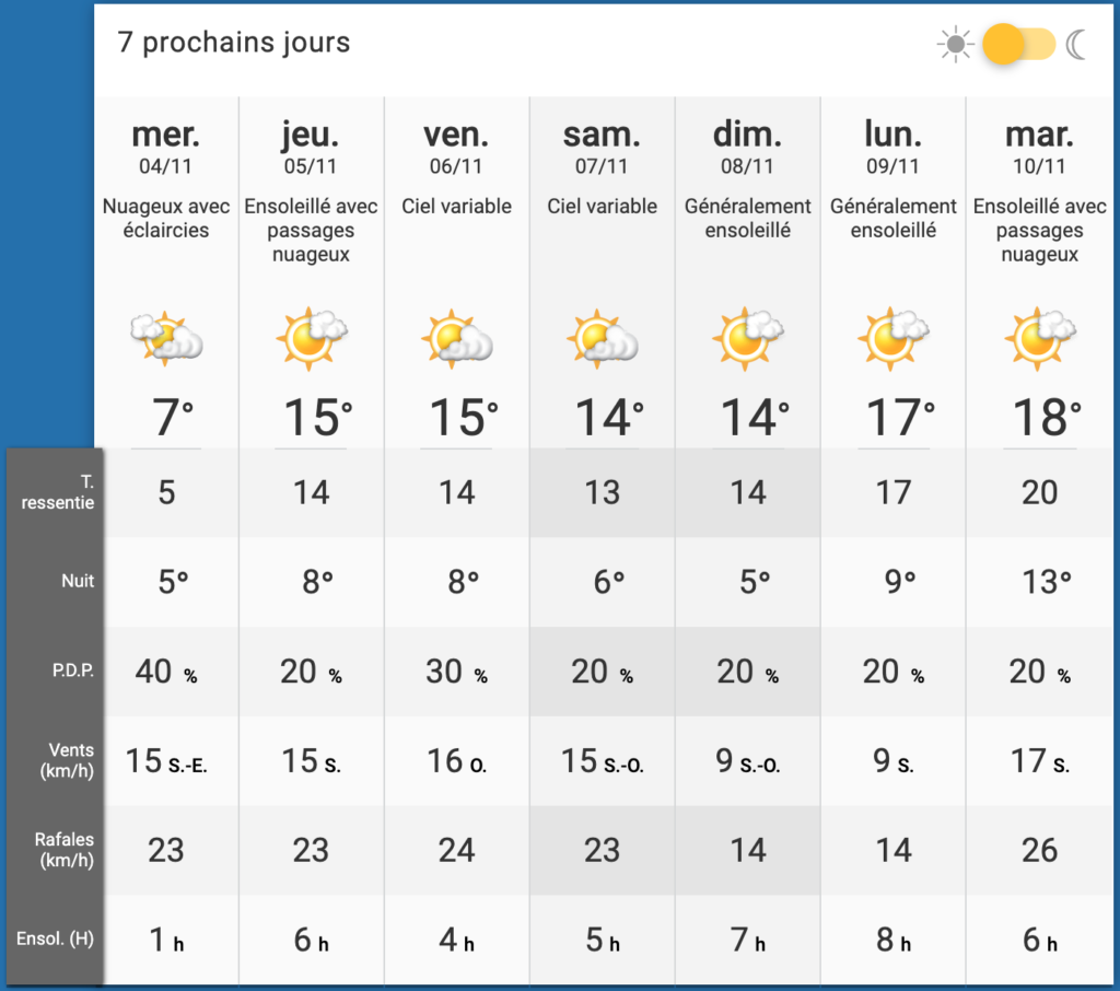 Selon MétéoMédia, les Montréalais pourront s'attendre dans les 7 prochains jours à des températures plutôt chaudes, entre 7°C et 18°C, avec même une température ressentie de 20°C mardi prochain, le 10 novembre 2020!