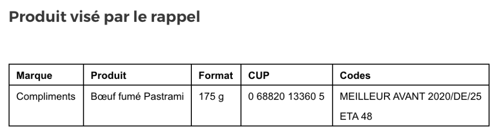 Selon un avis émis par l'Agence canadienne d'inspection des aliments (ACIA), les Aliments Levitts (Canada) Inc. procèderaient présentement au rappel du produit Bœuf fumé Pastrami de la marque Compliments, puisque celui-ci pourrait être contaminé par la bactérie Listeria monocytogenes.