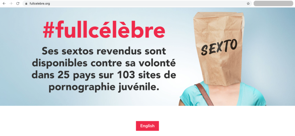 « Yasmine est devenue full célèbre. Ses sextos revendus sont disponibles contre sa volonté dans 25 pays sur 103 sites de pornographie juvénile », peut-on lire au-dessus et en dessous de l'image d'une jeune femme portant un sac en papier brun sur la tête, où il est inscrit « Sexto ».