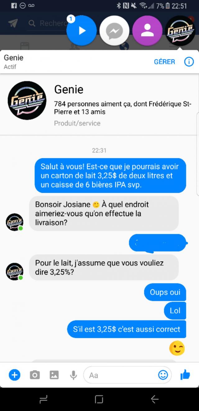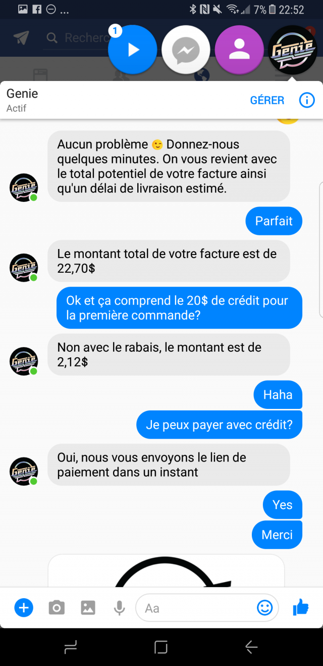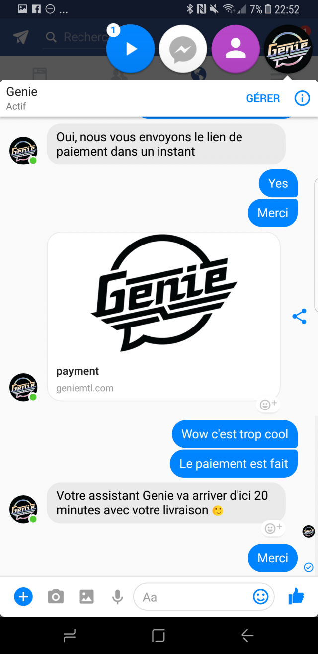 Comme tu peux le voir, tout se passe via Facebook Messenger. Tu contactes Genie via Facebook, tu leur fais ta demande. Il y a des gens en ligne pour te répondre 7 jours sur 7. Tu seras toujours avisé du prix et du délai avant de confirmer, puis tu recevras le lien où tu pourras payer (tout se fait en ligne).